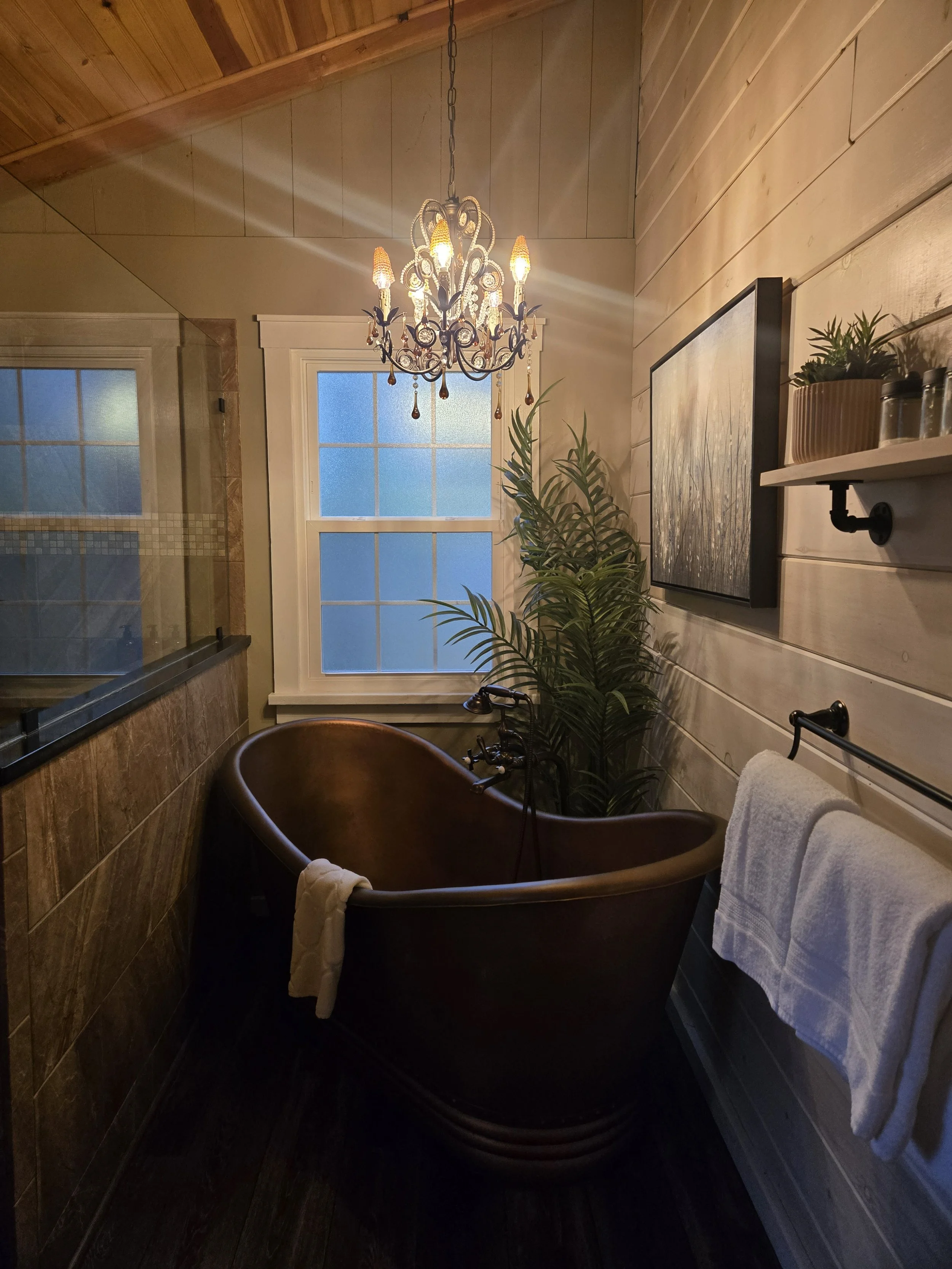 Though nestled within the rugged Appalachian Mountain range, our cabin had a king-sized bed, a wrap-around covered porch, a bonfire pit, and a copper bathtub.