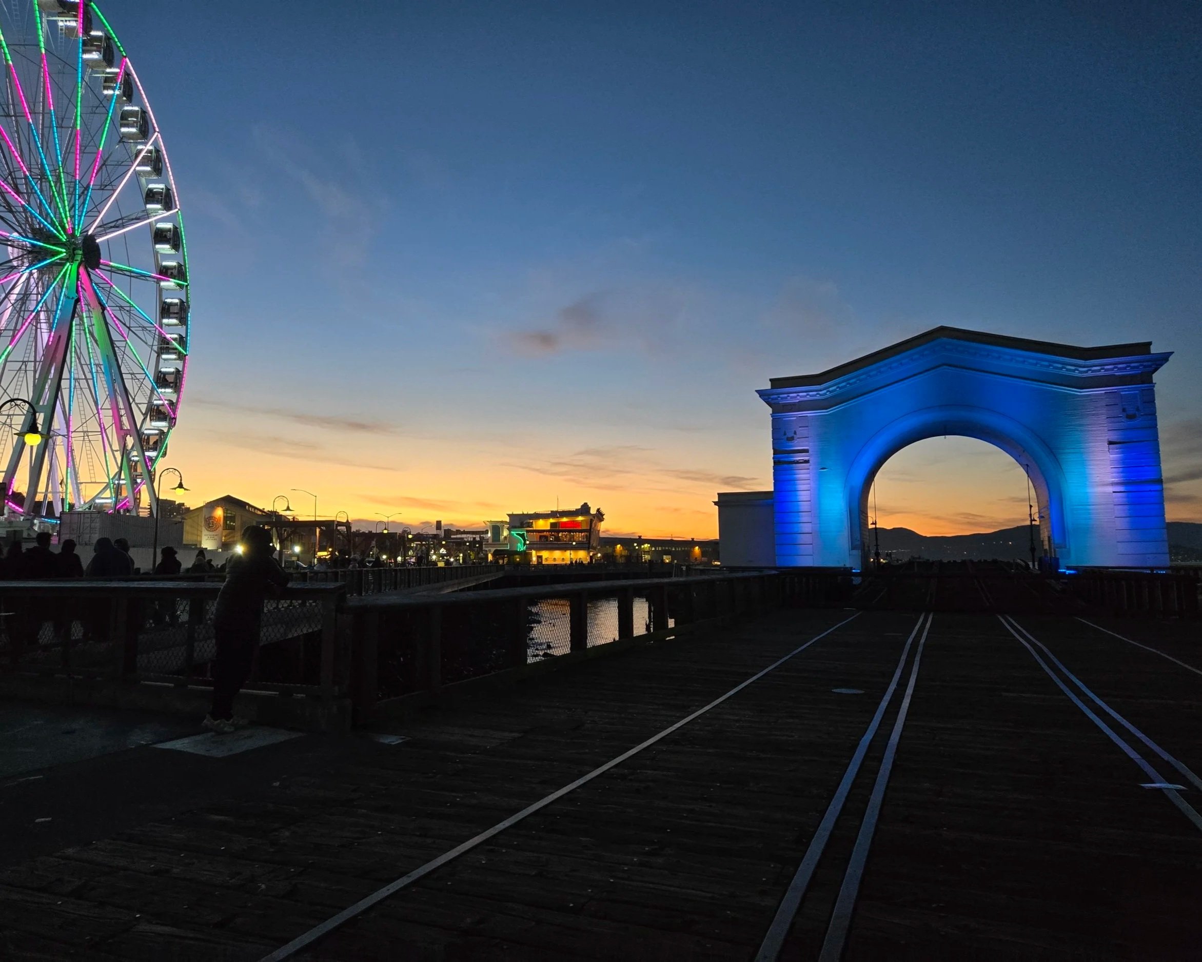 The Pier 43 Ferry Arch lit up at sunset.