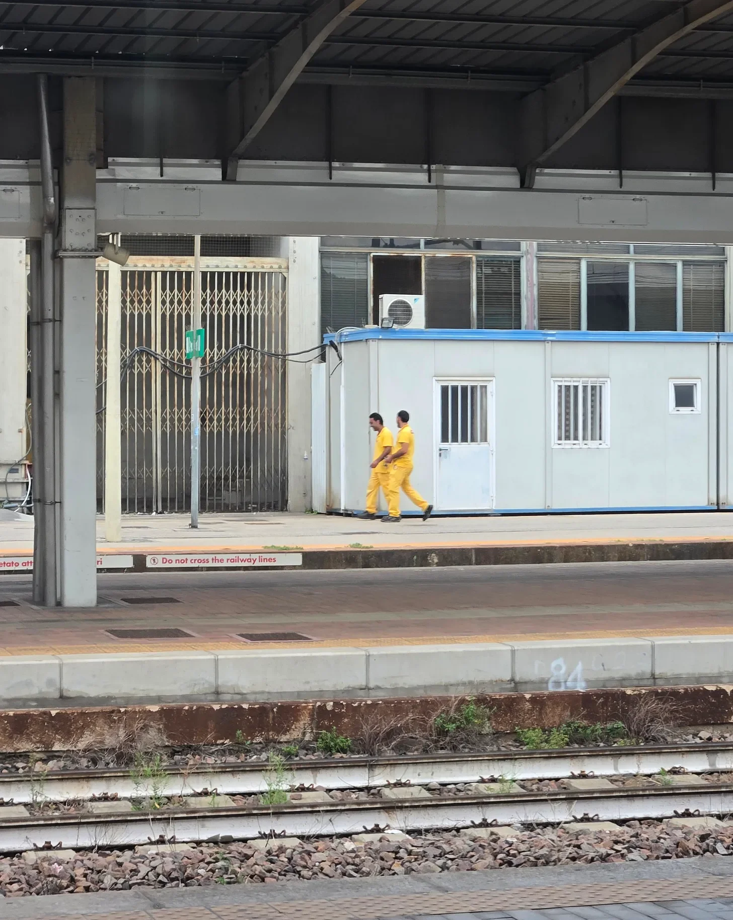 Two transportation workers enter Venice Mestre, which is the station right before getting to the historic Venetian islands.